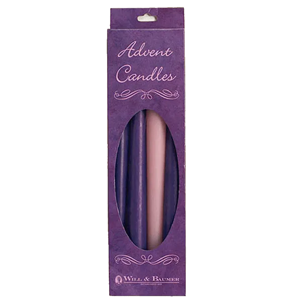 Made by WIll and Baumer, these advent candles are perfect for the home. 7/8 inch diameter fits standard home advent wreaths. 12 inches tall.