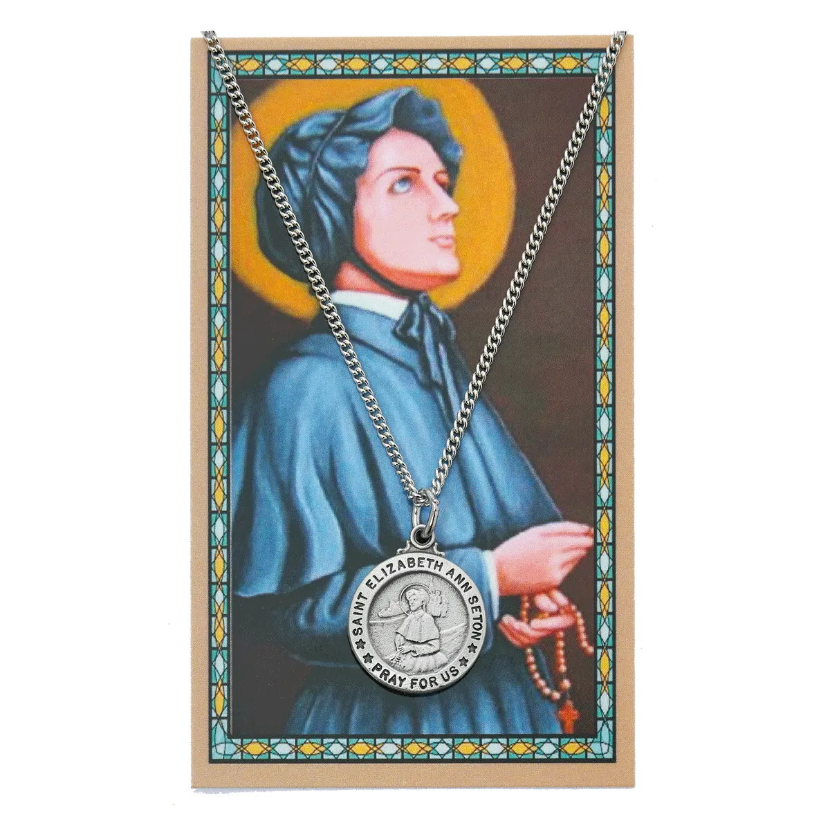 Sold individually and includes a prayer card with an image of the saint.