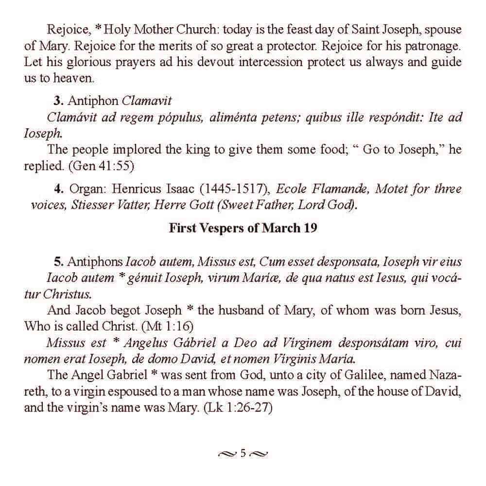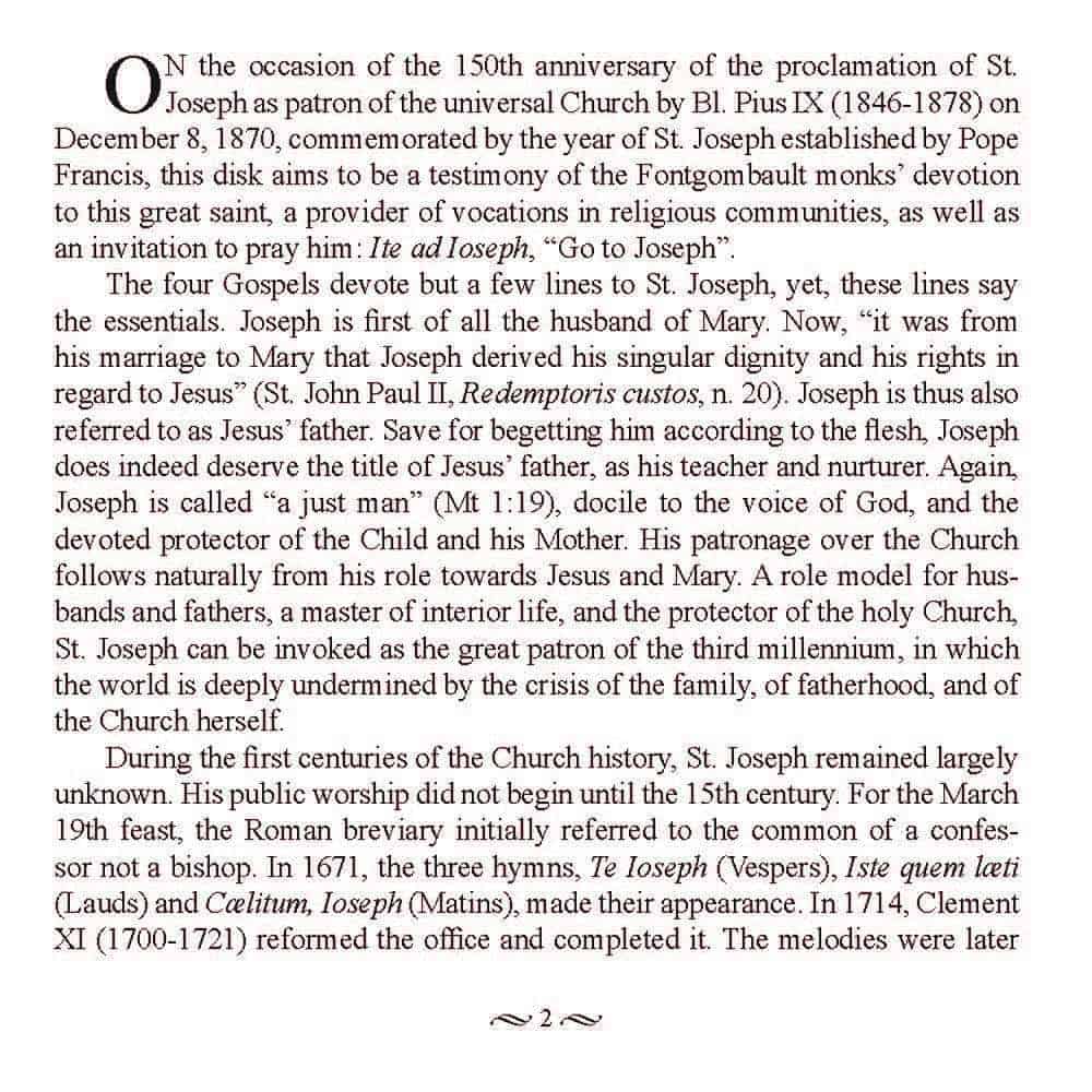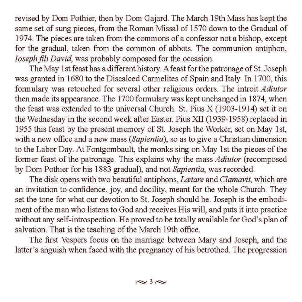 The pieces chosen for this album come from the Masses and Offices sung for the two traditional feasts in honor of Saint Joseph: March 19 and May 1.