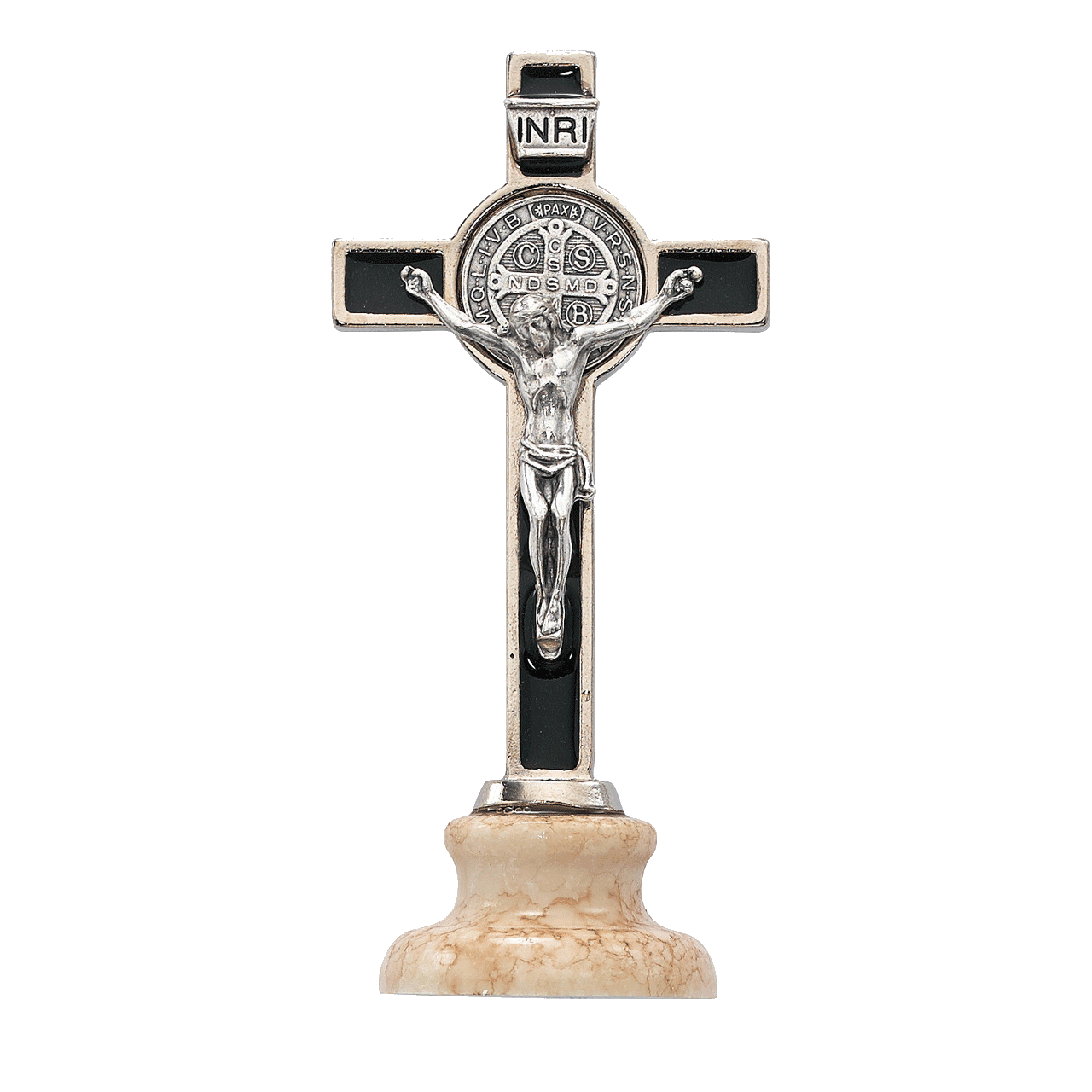 A high-quality crucifix, made in Italy. A metal corpus on an enamel and metal cross with a Saint Benedict Medal. Includes an attached 1 inch high resin base, finished to look like marble.