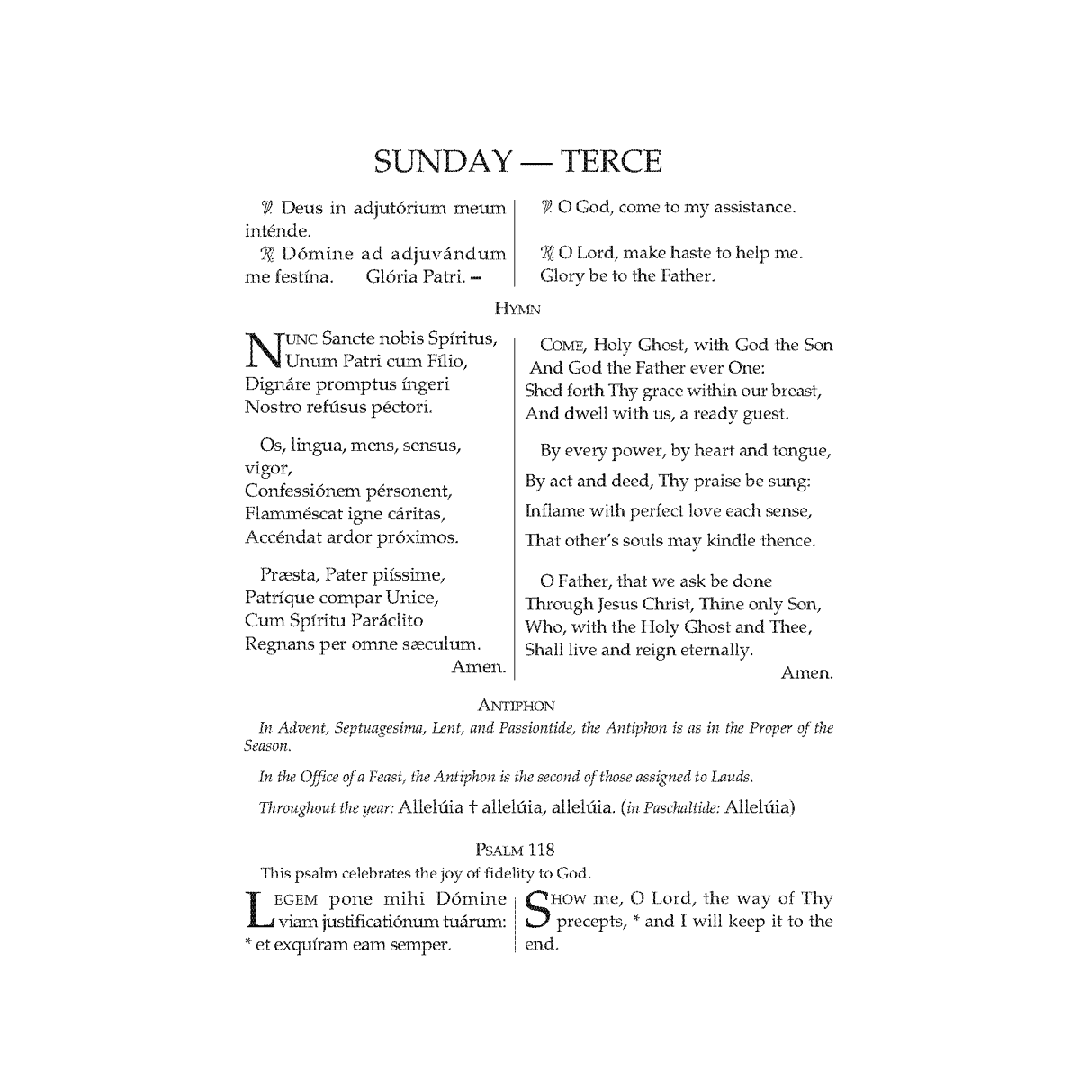 - Follow the offices of Terce, Sext, and None according to the Monastic Breviary of 1962 in Latin and English.